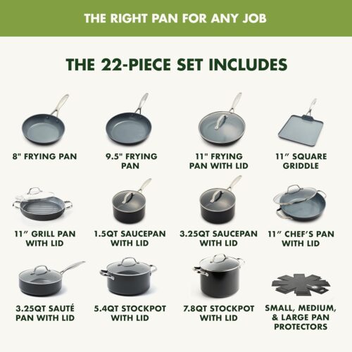 • 22 PIECE SET: Includes 8” and 9.5” frying pans; 11” frying pan with lid; 11” grill pan with lid; 11” chef’s pan with lid; 11” square griddle pan; 1.5qt and 3.25qt saucepans with lids; 3.25qt sauté pan with lid; 5.4qt and 7.8qt stock pots with lids; small, medium, and large pan protectors.