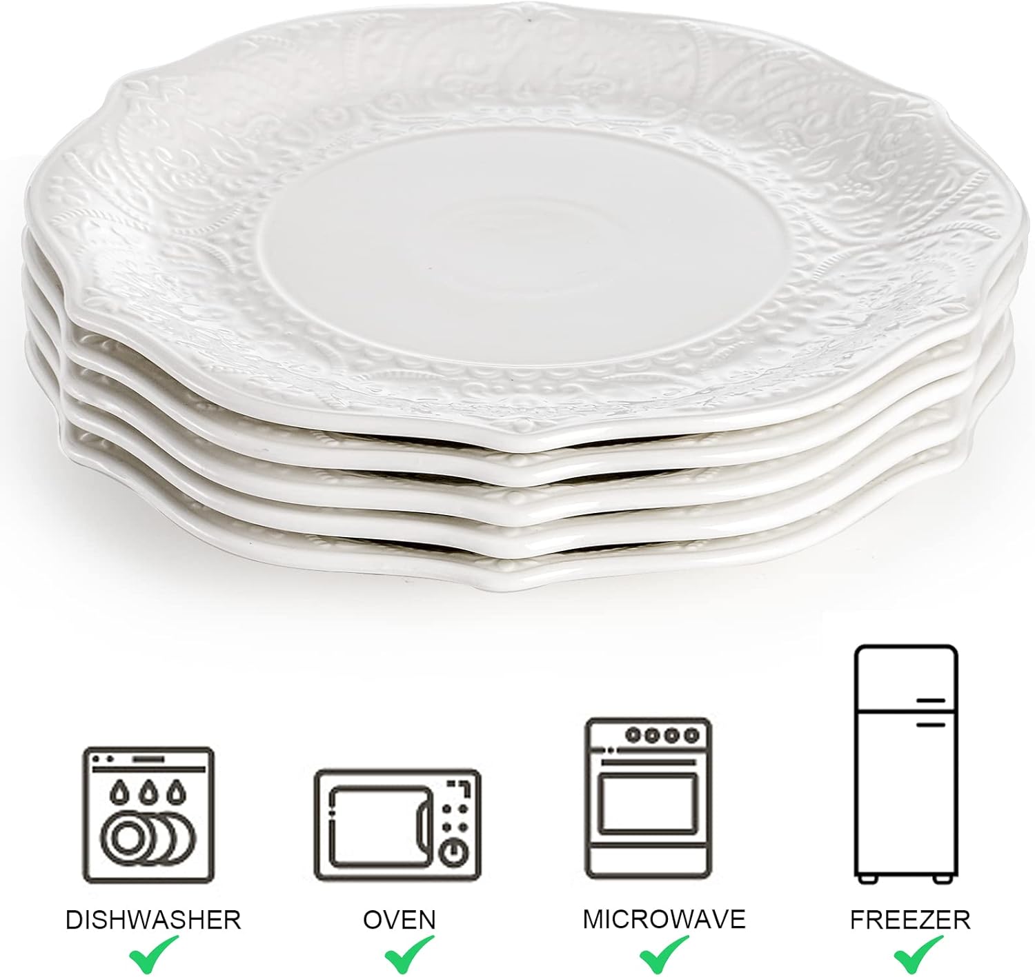 SOUJOY Set of 6 Porcelain Dinner Plate, 10.5” White Dinner Dish, Embossed Printing Dinnerware Plate for Dinner, Restaurant, Family Party and Kitchen, Microwave, Dishwasher Safe